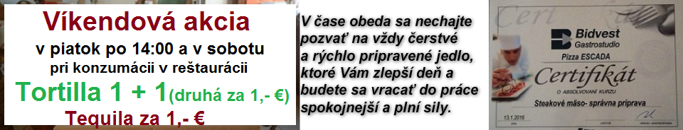 7,80 eura – 400 g Tortilla /2 ks/ plnená trhaným mäsom,olivami,šunkou,zeleninou,dresingom a 150 g hranolky 1,10 + Buritto za 1 euro Iba v reštaurácii